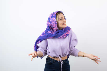 Portrait of fashionable young woman with perfect make up posing in colorful Russian shawl on her head, isolated on gray background.
