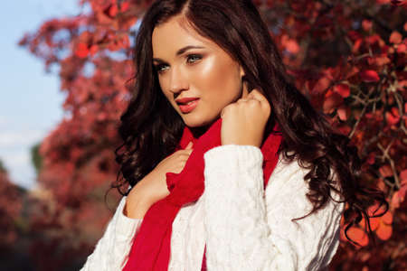 Portrait of beautiful pretty smiling girl with fashion makeup and flawness skin is wearing white warm sweater and red scarf in autumn colorful park