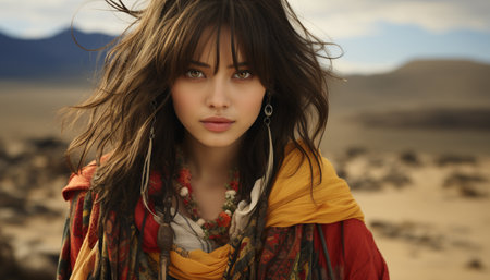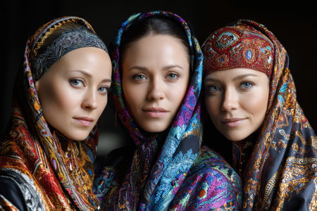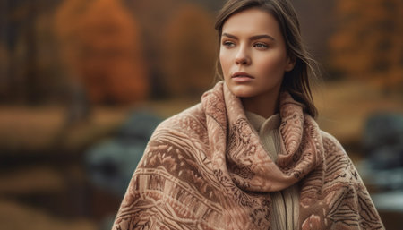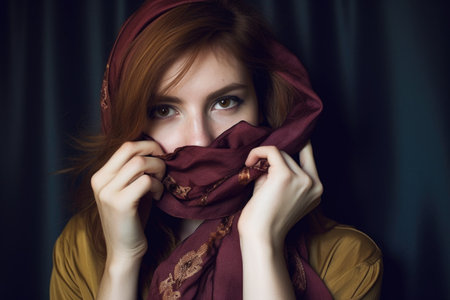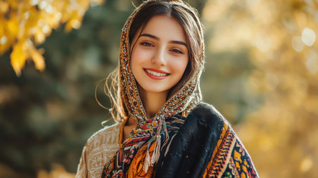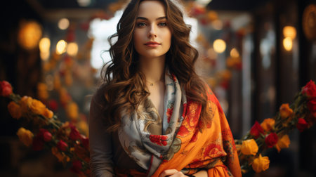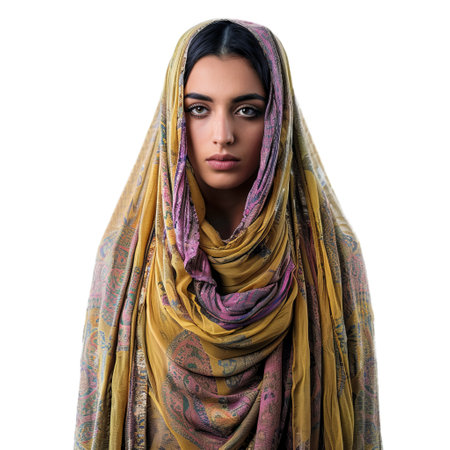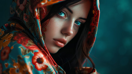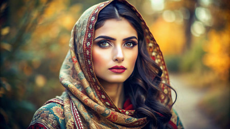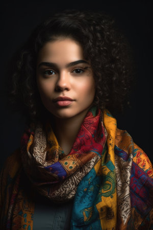 Portrait of a graceful woman adorned in a vibrant, patterned shawl