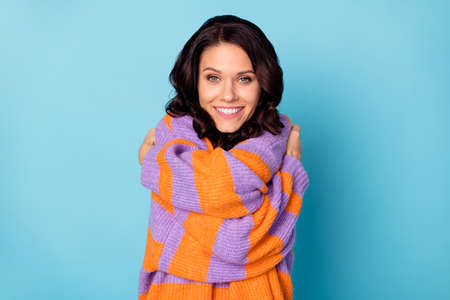Portrait of attractive cheerful wavy-haired girl hugging herself enjoying comfort warmth isolated over bright blue color background