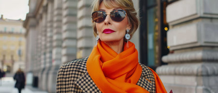 An elegant woman in her fifties stands confidently at a street corner, wearing a stylish oversized orange scarf and checkered coat, holding a handbag and sporting sunglasses.