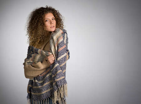 Young woman with curly hair, studio. Woman is frozen wrapped scarf
