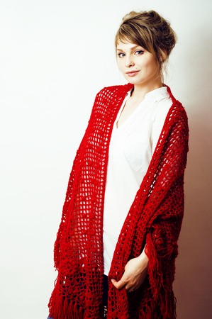 pretty young blond real woman with wool wrap in studio on white background messed hair