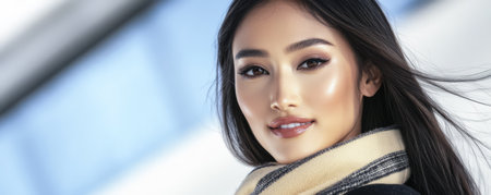 A woman with long dark hair smiles while wearing a scarf standing in an urban environment. Bright blue and white elements create a modern atmosphere emphasizing her fashionable style.