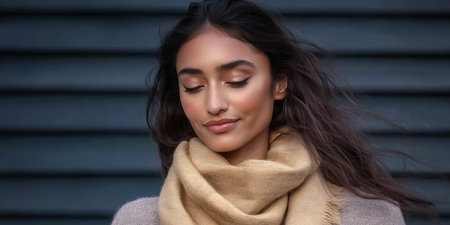 A woman stands outdoors wearing a soft scarf and sweater her long hair flowing gently. She appears serene and contemplative with her eyes closed. The background has a textured wall.