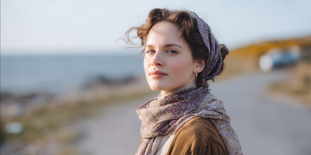 A young woman with curly brown hair and a patterned headscarf looks out towards the sea.