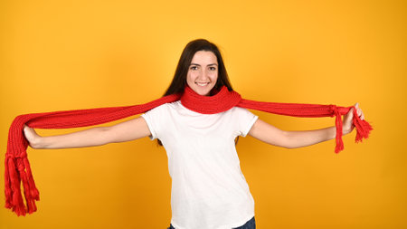 Beautiful girl with clean skin and dark long hair in cozy white sweater and warm scarf on the beige background