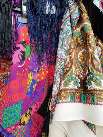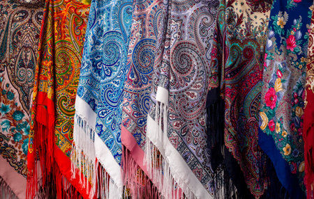 A row of colorful paisley scarves hang on a rack. The scarves are of different colors and patterns, and they are arranged in a neat row. Concept of variety and diversity