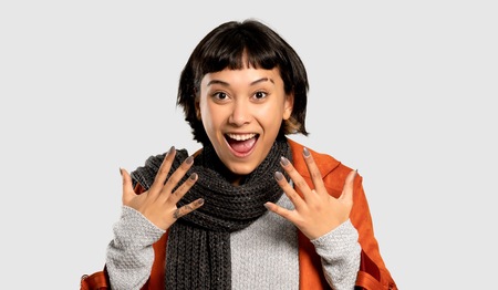 Short hair woman with coat with surprise facial expression on isolated grey background