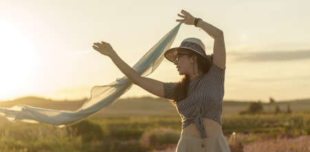 femininity, dance, provence style concept - banner happy young girl Caucasian Slavic appearance in woven straw hat is blowing scarf made of thin long fabric in wind on lavender field on summer sunset