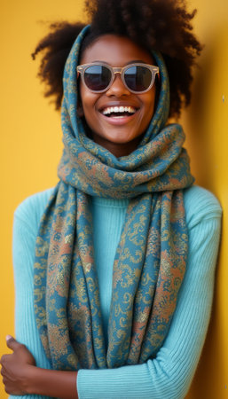 Joyful woman in stylish scarf and sunglasses against a bright yellow backdrop