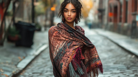 A model posing on a cobblestone street, wrapped in a bohemian-style shawl with tassels