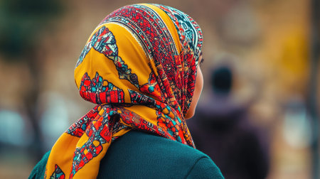A woman wearing a vibrant headscarf showcases cultural identity and tradition while navigating an urban environment, embracing both heritage and modern fashion sensibilities.