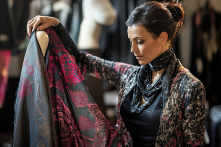 A designer skillfully drapes vibrant fabric over a mannequin while deeply focused. The studio is filled with creativity and artistic energy, perfect for fashion design.