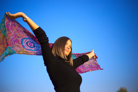 A closeup shot of a beautiful young lady with a bob haircut holding a colorful scarf against the wind