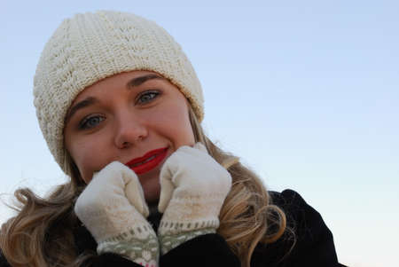 The girl in winter clothes. On a background of the blue sky