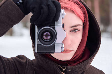 Portrait of woman with bright pink hair with retro camera in winter forest.