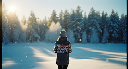 A young woman in a winter landscape, wearing a cozy sweater and a beanie, surrounded by snow-covered trees, evoking a serene and chilly atmosphere