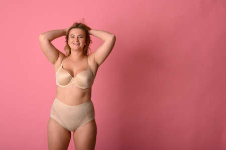 Pretty oversize woman posing in studio - Beautiful girl accepting her body imperfection, beauty shot in studio - Concepts about body acceptance, body positivity and diversity