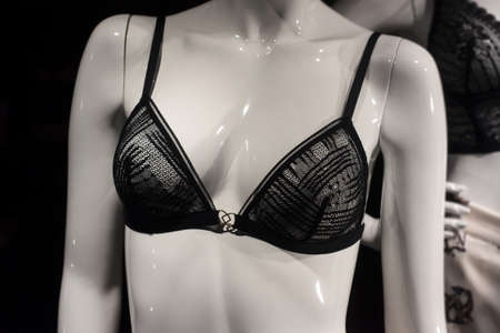 Closeup of black transparent bra on mannequin in fashion store showroom