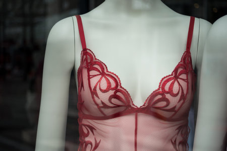 Closeup of beige bra and transparent shirt on mannequin in a fashion store showroom