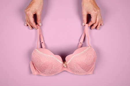 Woman hand holding bra on pink background. Lingerie in hands, fashion and sale concept
