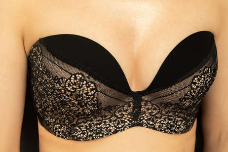 Plus size fat mature unrecognizable woman wearing black lace soft bra. Female breast in lingerie. Bosom, brafitting and underwear concept.