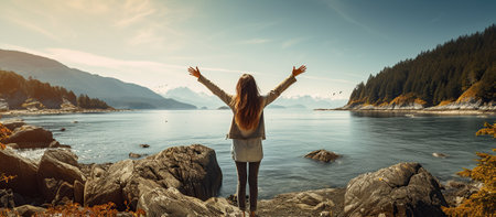 Woman with outstretched arms enjoying the wind and breathing fresh air on the rocky beach