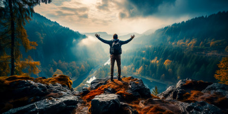 Female hiker, full body, view from behind, standing in a coniferous forest with raised arms, hands clenched into fist - Generative AI
