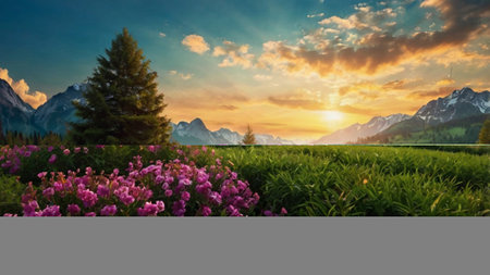 Panoramic view of alpine meadow with blooming flowers at sunset.