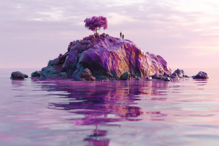 Two figures stand on a rocky island with a colorful tree under a pastel sky.