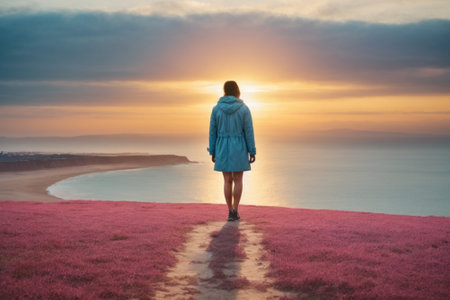 Woman standing on a pink flower meadow looking at the ocean at sunset