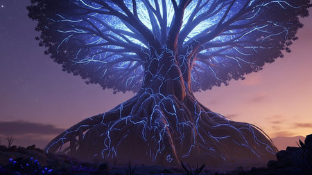 A large, mystical tree glows with blue energy in its roots and branches against a twilight sky.