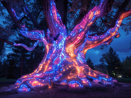 Chlorophyll molecule projection on a giant sequoia highlighting the unseen process of photosynthesis in neon colors