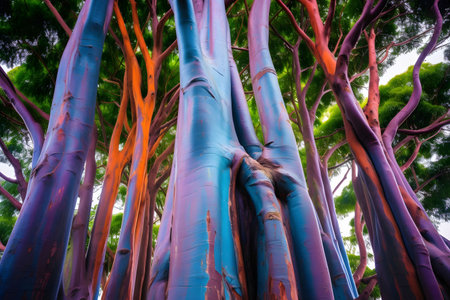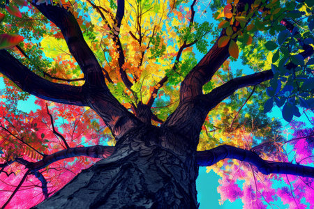 This artwork depicts a stylized tree with a vivid display of colors, highlighting its textured bark and abundant foliage. The composition features a rich palette of blues, purples, and yellows. The overhead perspective, coupled with a cosmic-themed sky, suggests a surreal environment suitable for various creative applications.
