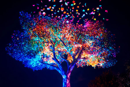 A mesmerizing tree illuminates the night with bright colors as its leaves appear to float upward, creating a surreal and magical atmosphere in the dark landscape