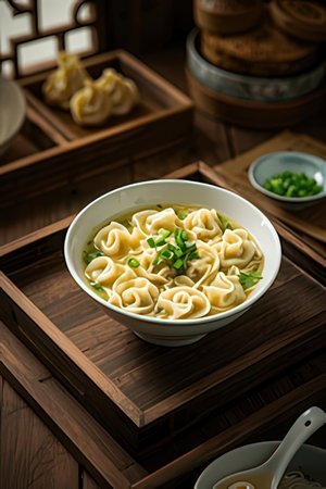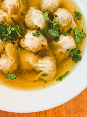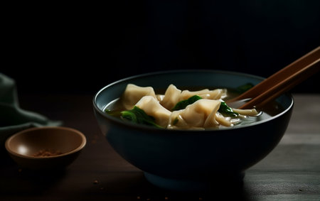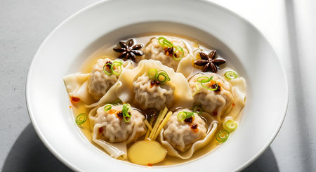 Delicious bowl of steaming wonton soup with star anise and fresh herbs a comforting asian delicacy