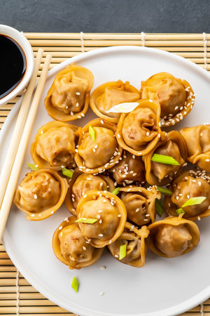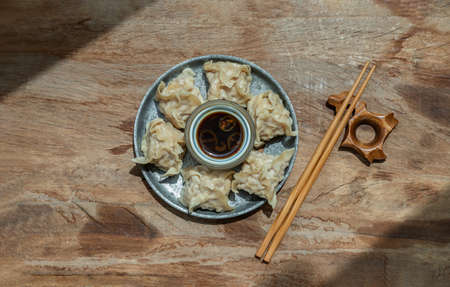 Delicious shrimp dumplings served with Soy sauce and Wooden chopsticks. Steamed wonton dumpling stuffed with shrimp, Asian cuisine, Top vew, Copy space, Selective focus.
