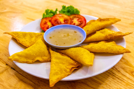 Thai style deep-fried pork dumpling serving with sweet sauce