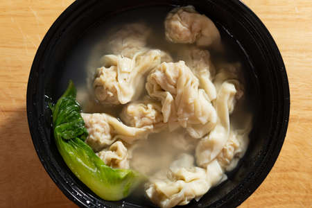 Chinese wonton soup with pork in black bowl, top view, copy space