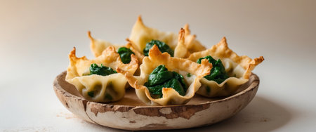 AI Generated. Crisp Golden Fried Dumplings with Spinach Filling in a Rustic Wooden Bowl