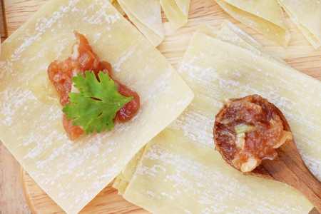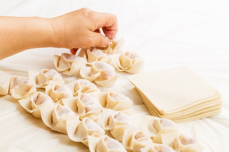 Wrapping Wonton and raw ingredients isolated at kitchen