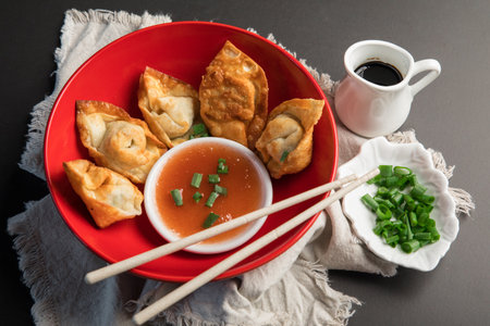 Pangsit, Pangsit Goreng, Delicious Pangsit Ayam Goreng (Chicken Fried Dumpling), Indonesian Traditional Food made from flour and chicken. Served on plate. Selective focus and close up image.