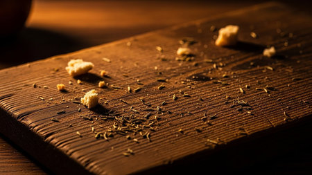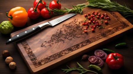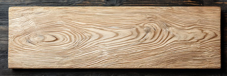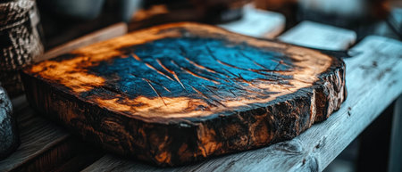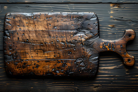 Rustic wooden cutting board with an intentionally burnt texture, showcasing intricate patterns and grains. it rests on a dark wooden surface, providing a striking contrast. ideal for kitchen decor, food photography, and culinary-themed designs. Generative AI