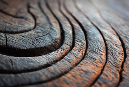 Detailed macro shot of aged wooden surface with intricate lines and textures, natural light