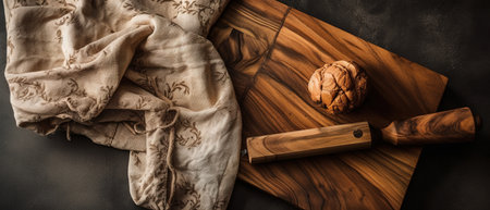 Wooden cutting board on stone kitchen table. Flat lay with copy space