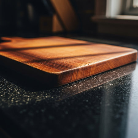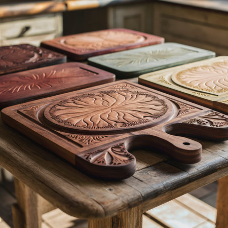 Unique wooden cutting board showcasing vibrant knife marks and rich textures in a kitchen setting