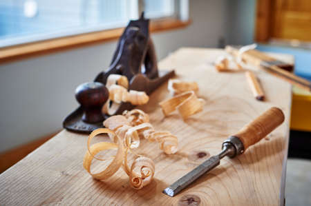 Woodworking vintage tools chisels with wood shawings on retro workbench.