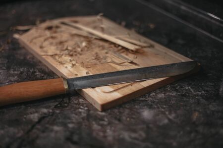 the carpenter's hands are cut with a tool on a board, a carpenter works in a workshop, a chisel in wood, sawdust. High quality photo