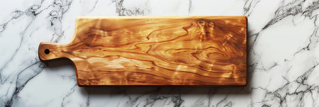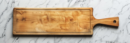 A wooden cutting board sits on a marble countertop. The board is large and rectangular, with a wooden handle on one end. The marble countertop is smooth and shiny, giving the cutting board a clean